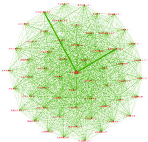 图 2 为 2021 年至今西部高校学术合作网络拓扑图。图中展示了多个节点,每个节点代表一个西部高校,而连接它们的线则表示这些高校之间的学术合作关系。