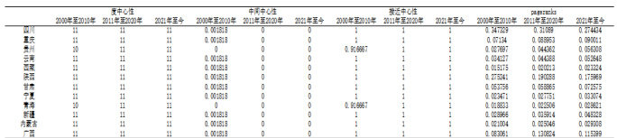 表 2 展示了西部地区各省份在三个不同时间段的学术合作网络中心性分析结果。表 2 包含了度中心性、中间中心性、接近中心性和 PageRank 四种指标,这些指标反映了各省在学术合作网络中的地位和影响力。