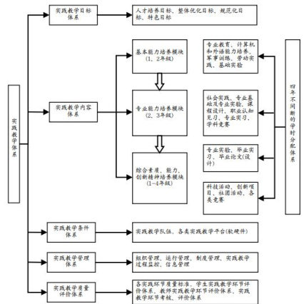 实践教学是高等学校教学工作的重要组成部分,是培养学生创新精神、实践能力的重要途径。坚持学生中心的教育理念,坚持以培养学生的创新创业和实践能力为核心、以满足学生创业就业所需的实践知识和能力为目标,精心组织、科学设计实现人才培养目标的实践教学体系,整体构建满足专业高素质应用型人才培养的实践教学体系,全面提高实践教学质量和人才培养质量。见下图: