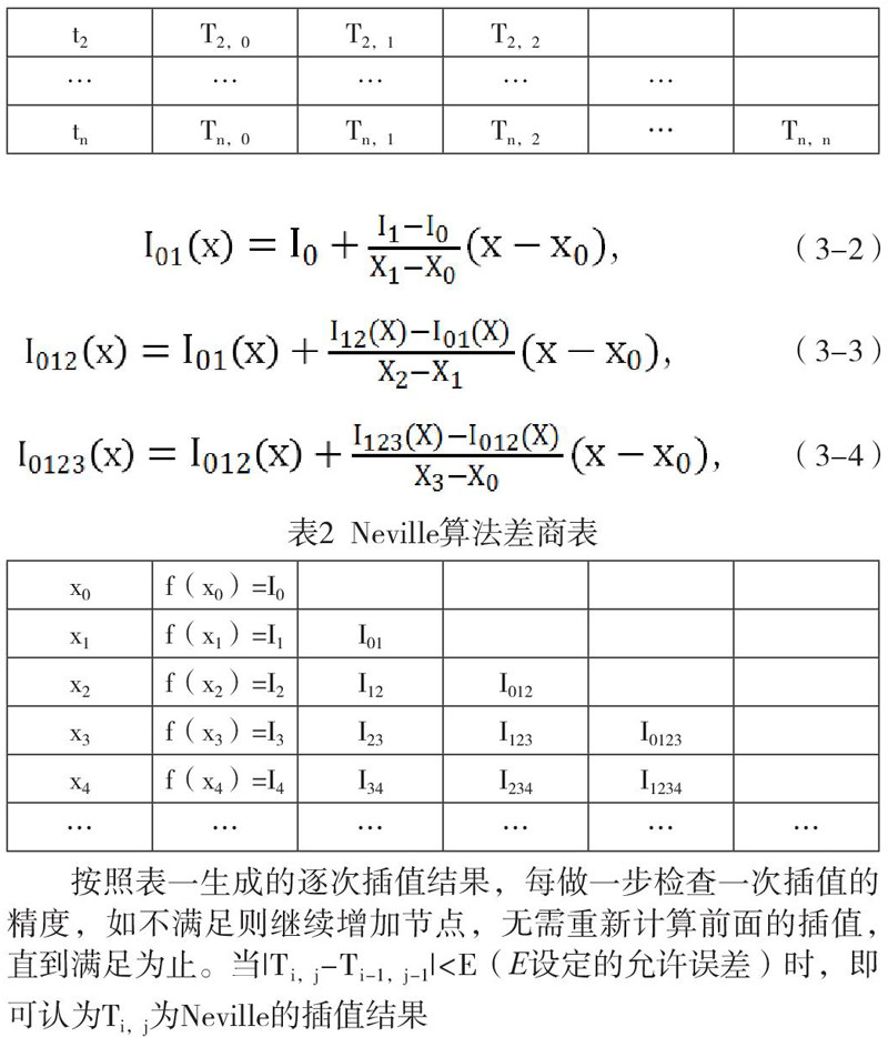 按照表一生成的逐次插值结果,每做一步检查一次插值的精度,如不满足则继续增加节点,无需重新计算前面的插值,直到满足为止。当|Ti,j-Ti-1,j-1|<E(E设定的允许误差)时,即可认为Ti,j为Neville的插值结果