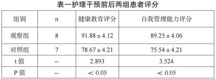 对比两组患者干预前后的健康教育评分和自我管理能力评分,两组患者干预前的指标差异无统计学意义(P>0.05)。两组患者干预后的各项指标评分差异显著,有统计学意义(P<0.05)。