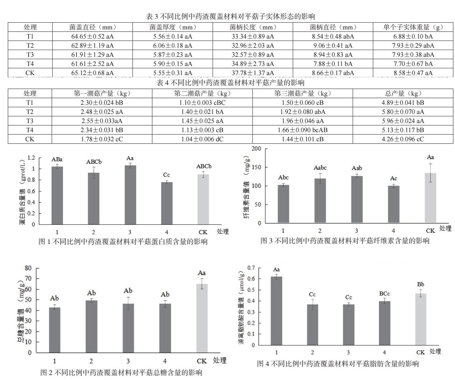 平菇为低脂肪的食用菌类,其含量越低越好。由图4可知,T1的脂肪含量最高,比对照极显著提高24.2%;其他处理的脂肪含量则低于对照,T2和T3的脂肪含量最低,均比对照低21.3%,且达到极显著差异水平。各处理之间相比,T1的脂肪含量与其他处理均达到极显著差异水平,T2和T3的脂肪含量差异不显著。由此表明,覆盖材料全部为中药渣时,平菇中脂肪含量最高;覆盖材料中加入适当比例中药渣则可降低平菇脂肪含量,其中以T2和T3的脂肪含量最低。