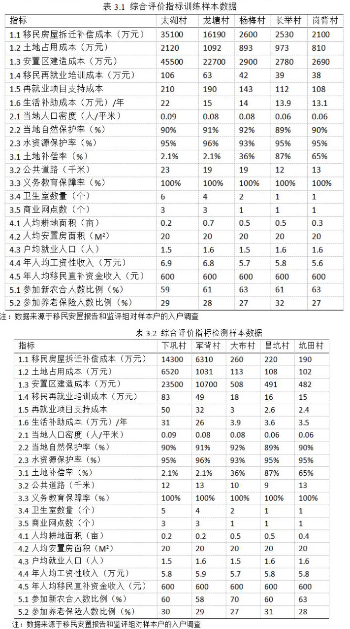 根据太湖村、龙塘村、杨梅村、长举村和岗背村等5个移民样本村的数据来作为本模型的学习训练样本,经过训练学习后建立起神经网络,指标来自前文所提数据报告,对应的期望输出按照国家水库移民安置政策效果评定指导意见进行等级划分,并进一步将其对应为期望输出向量。