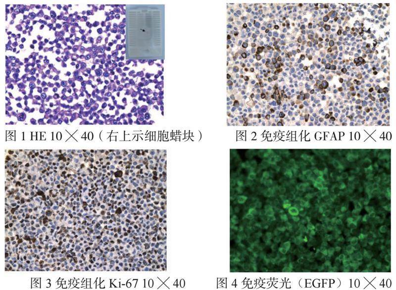 2.2免疫组化及免疫荧光标记结果抗体GFAP在瘤细胞弥漫性表达,胞质呈棕黄色着色(见图2);Ki-67在瘤细胞弥漫性表达,胞核呈棕黄色着色(见图3);绿色荧光标记瘤细胞胞质显示绿色荧光(见图4)