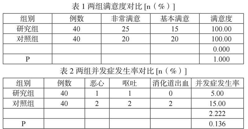 采用满意度调查表评估患者对护理的满意度,分为满意、基本满意。观察两组患者的并发症发生情况,主要包括恶心、消化道出血和呕吐[2]。