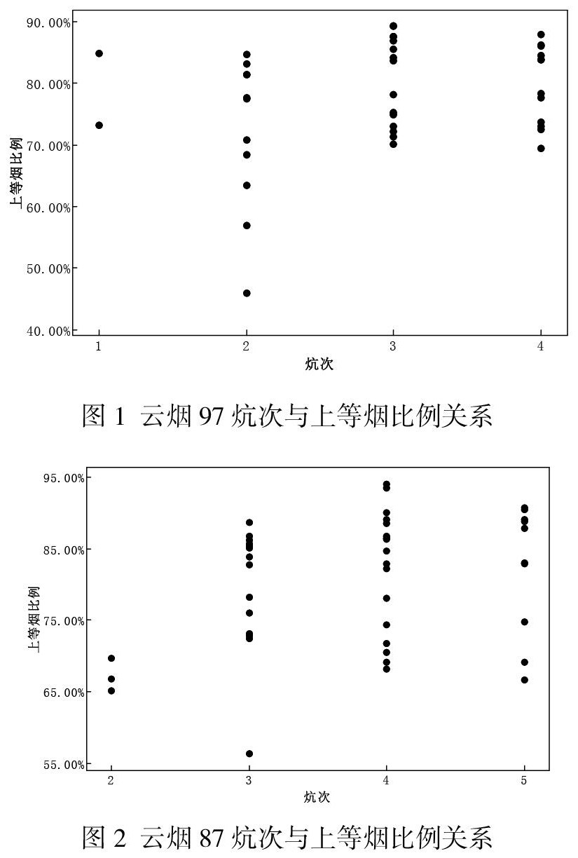 鲜烟质量是决定烤后烟叶质量的一项重要因素。通过数据分析表明,采收烟叶成熟度和成熟度一致性对烤后烟叶质量影响最明显。采收的烟叶类型、长势、病害等因素也对上等烟比例造成一定的影响,部分因素如烟叶类型可通过烘烤工艺弱化影响。从收集数据统计得出,云烟87最佳鲜烟质量组合为烟叶类型为正常烟,长势中等,无病害,成熟度为6,云烟97最佳鲜烟质量组合为烟叶类型为正常烟,长势中等,无病害,成熟度为7。据笔者了解,在实际烟叶烘烤中,鲜烟质量存在几十甚至几百种不同组合,如何获得最佳的上等烟比例,仍需通过大量的数据分析调优。