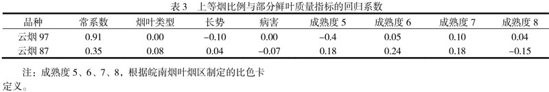 评价鲜烟质量指标包括采收烟叶部位(用炕次描述)、采收成熟度、烟叶长势(中等、偏旺、偏弱)、病害(无病害、青枯病、花叶病)以及采收时的天气条件(正常烟、雨淋烟、雨后烟、高温逼熟烟)等,对指标进行量化处理后,采用回归模型分析法,建立上等烟比例与鲜烟质量粗略的回归关系(P=0.003<0.05),由回归系数可以看出,鲜烟采收成熟度是影响烤后烟叶质量的第一关键因素,云烟97鲜烟成熟度7占总采收烟叶比例越大,云烟87鲜烟成熟度6占总采收烟叶比例越大,上等烟比例越高。