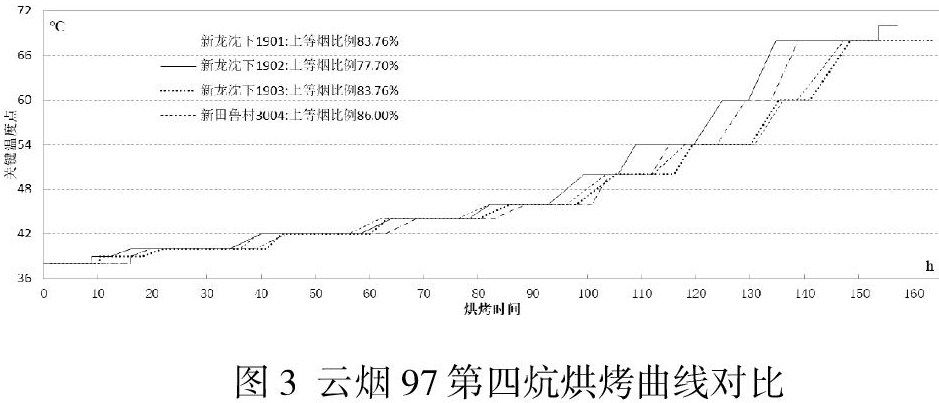 由图3可知,从总烘烤时长分析,云烟97第四炕次烟叶烘烤时长在150个小时左右为佳。分析烘烤各关键阶段,烟叶变黄阶段38-42℃,烘烤时长在 56-63个小时;烟叶定色阶段44-54℃,烘烤时长在70-74个小时;烟叶干筋阶段60-68℃,烘烤时长在23个小时左右,可适当缩减68℃稳温时长在10个小时左右。从关键温度点分析,烘烤曲线差异明显关键温度段处于[46℃,60℃] 之间。对比新龙沈下1902烤房与新田鲁村3004烤房,从[38℃,68℃]总烘烤时长约为154小时,[50℃,60℃]温度段之间,新田鲁村3004烘烤时间为43小时,新龙沈下1902烘烤时间为37小时,相差6小时。从上等烟比例看,[50℃,60℃]烘烤时长为43小时左右较好。