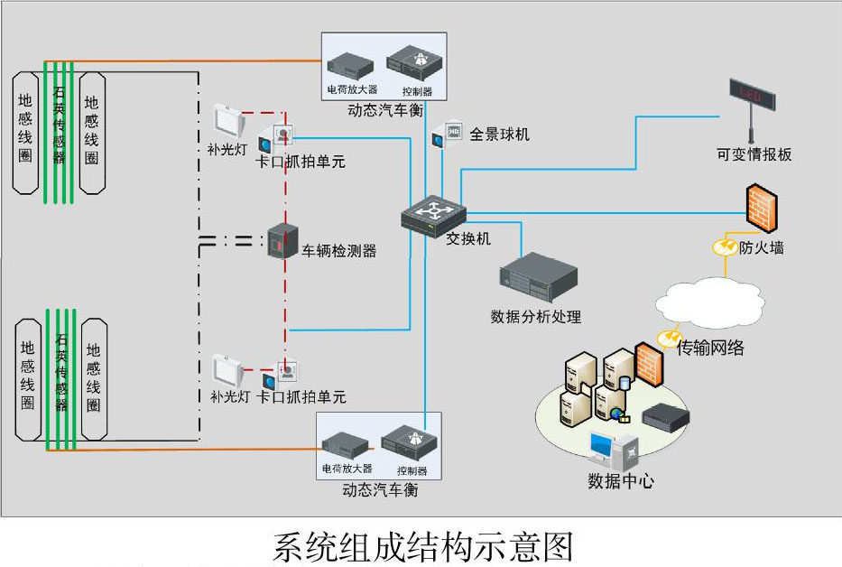 公路不停车检测系统主要包括动态称重子系统、取证抓拍子系统、信息发布子系统和视频监控子系统等几个重要的功能模块。系统组成结构图如下图所示。其中: