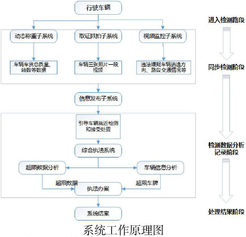 动态称重子系统,通过石英或平板等称重传感器、地感线圈、车辆检测器等获取车货总质量、轴数、车速等称重检测数据;取证抓拍子系统利用视频监控技术,获取车辆车头、车尾、车身三张照片以及一个短视频;信息发布子系统利用可变情报板,根据需要动态发布车辆称重信息、宣传标语和路况等,为车辆司机提供实时信息服务;视频监控子系统通过全景监控设备对各子系统运行状况、路面通行状况和道路环境状况等进行远程实时监控,便于执法部门进行临时工作调度、证据链补齐和远程指挥等。