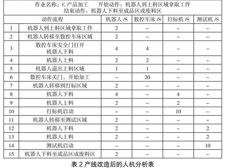 从表1产线改造前的人机分析表中可以看出:1)工人的利用率达到了100%,劳动强度非常大,需要一刻不停地进行工作。2)数控车床的利用率=T1/T=56%,数控车床有几乎一半的时间都处于闲置状态。3)打标机的利用率=T2/T=33%,打标机的利用率更低。4)测试机的利用率=T3/T=28%,测试机的空闲时间更长。整体来看,三台设备的运作效率非常低下。