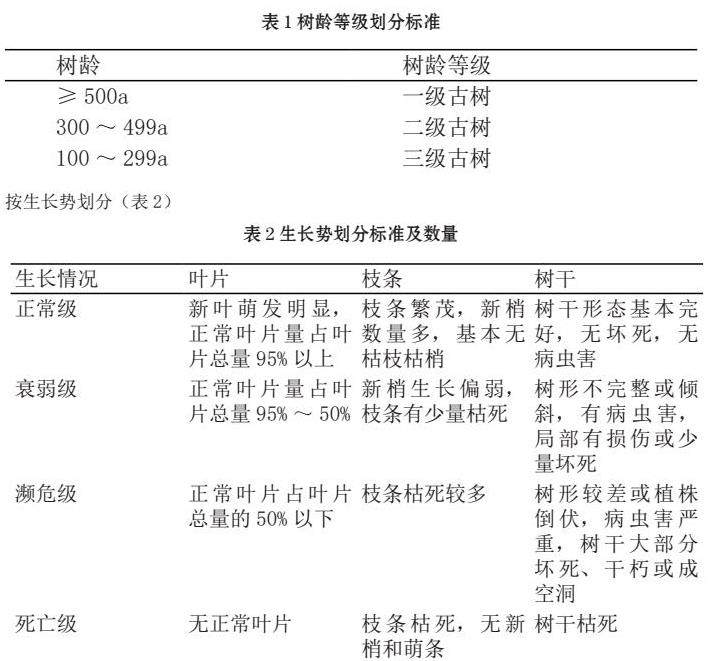 生长势划分:依据《古树名木普查技术规范》标准[11]及《古树名木鉴定规范》[12]划分树龄等级及生长状态。