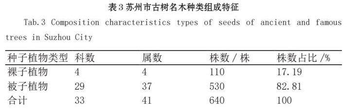 苏州市共有古树名木640株,隶属于33科41种,其中裸子植物4科4种,共110株,占苏州市古树名木总数的17.19%;被子植物29科37种,共530株,占苏州市古树名木总数的82.81%(表3)。
