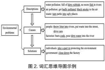 教师让学生提取听力中与环保有关的词汇并按功能归类,以思维导图的形式呈现;基础薄弱的学生可补全教师提供的思维导图(见图2)。