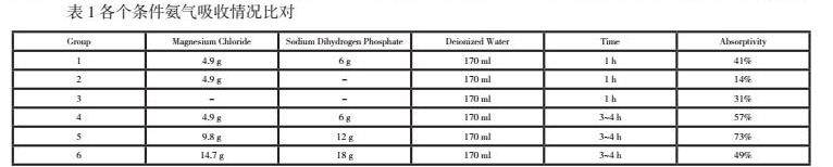通过搭建的装置,40℃加热浓氨水(100ml氨水),氨气通过管道转移至吸收装置中(吸收液:4.9g无水氯化镁、6g磷酸二氢钠溶于170ml纯水),随时间延长后,发现吸收装置中溶液变浑,3~4小时后停止加热,通过减重法,确认失去氨气1.44g,体系共吸收氨气0.82g,吸收率57%。继续延长3小时,吸收率降为50%,未再进一步延长吸收时间。