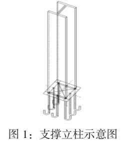 根据现场汽机岛的设计,与设计沟通确认后在汽机岛立柱中埋设支撑体系主要支撑柱,可采用H型钢或工字钢,规格及型号根据机组规模测算选取,支撑柱的埋设需横平竖直,且预留后续支撑纵横梁牛腿(见图1)。