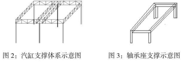 根据设计图纸尺寸及定位参数进行汽缸与轴承座支撑体系(见图2、图3)的制作,汽缸支撑纵横梁采用双层槽钢,下层为吊挂体系,上层为支撑体系,便于吊挂地脚螺栓与锚固板,上下层之间采用槽钢与角铁成三角形进行连接加固,汽缸支撑体系坐落于预埋立柱牛腿上并焊接牢固。轴承座采用槽钢单层且另设支腿支撑,支腿落于汽机岛轴承座基础下模板面。