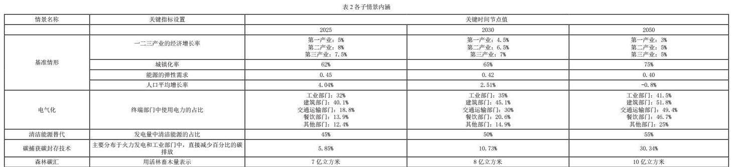 能源需求的预测往往受诸多因素的影响。为考察贵州省未来的能源需求和碳排放,基于与能源需求以及碳排放密切相关的主要驱动因素,结合贵州省相关政策目标和贵州省能源利用现状,设置了3种不同的综合情景:基准情景、低碳情景及强化低碳情景;5个子情形,基准情形,清洁能源发电替代、终端部门电气化加速、碳捕获和碳封存技术、森林碳汇。低碳情形即清洁能源发电替代、终端部门电气化加速、碳捕获和碳封存技术的综合,强化低碳情形是低碳情形和森林碳汇情形的综合。文中碳汇的计算主要参考李笑笑(2020)、令狐大智与罗溪(2022)的计算方法[11,12]。人口对能源的消费弹性系数主要参考]夏泽义与张炜(2009)的计算方法[13]。各子情景内涵如表1、表2所示。