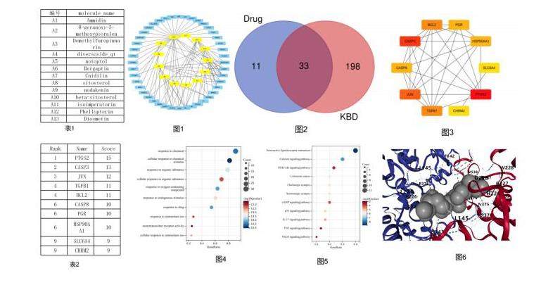 通过中药系统药理学数据库与分析平台(TCMSP)以羌活为关键词,筛选符合口服生物利用度(OB)>30%和类药性(DL)>0.18的化学成分,获取其靶点信息,并在String数据库中获得靶点基因Symbol。使用OMIM数据库以“Kaschin-Beckdisease”为关键词获取KBD相关靶点基因,预处理后,利用Venny工具绘制交集靶点的韦恩图,并通过Cytoscape3.7.2软件构建“药物-活性成分-KBD靶点”网络。为进一步分析交集靶点的相互作用,使用String数据库构建蛋白互作网络(PPI),设定物种为人类,关联水平为0.4。随后,通过Cytoscape软件进行可视化,使用Degree值识别关键靶点。将交集靶点导入Metascape数据库进行GO功能和KEGG通路富集分析,包括分子功能、细胞成分、生物过程等,使用GraphPadPrism软件可视化分析结果,展示羌活治疗KBD的主要作用通路。通过Pubchem数据库获取羌活关键活性成分的3D结构,导入AutoDock软件进行能量最小化处理。利用RCSBPDB数据库查找关键靶点的3D蛋白结构,并在AutoDock中进行去水、加氢、加电荷处理。随后使用AutoDockVina软件进行分子对接,计算最低结合能。对最低结合能最低的分子对进行分析,并通过Pymol2.4.0软件进行可视化展示。
