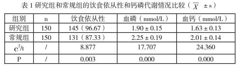 研究组的饮食依从性较常规组高,护理后的血磷、血钙指标较常规组低,有差异(P<0.05),见表1: