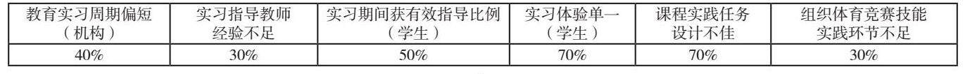 体育教育专业教学实践环节在实际操作过程中,遭遇了一系列挑战与难题。于教育实习领域,针对院校的实习规划调查揭示,约有40%的机构实习周期偏短,平均实习周期少于4周,从而限制了学生深入体验实习环境的机会。此外,据观察,大约有30%的实习指导教师未能积累超过特定年限的实际教学经验,这在指导学生时往往显露出明显的不足。据学生反映,他们在实习期间遇到难题时,能够获得有效指导的比例,大约只有半数。实习体验的多样性显得相对匮乏,据约七成学生反馈,他们的实习经历主要局限于旁观,主动实践与深入思考的机遇显得颇为稀缺。在课程实践环节的审视中,我们对实践任务的评估揭示,有超过70%的任务设计未能展现出系统性和创新性,而是倾向于简单地重复性练习,这表明在任务设计上存在显著的提升空间。例如,在培育学生组织体育竞赛技能时,仅有大约30%的实际练习环节涵盖了复杂竞赛的筹备与执行;至于在制定个性化体育教学计划上,能够激发学生创新思维的任务占比仅约20%,这显著制约了学生综合实践能力的全面发展。如表1