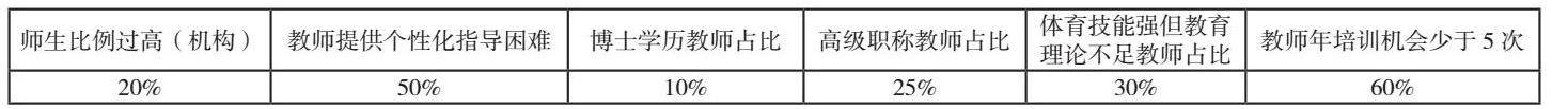 体育教育专业师资队伍在规模、构成与素质方面,正面临多重挑战与复杂局面。在对个别教育机构进行量化分析后,我们发现约有20%的机构中,师生比例显著超过1:30,这揭示了教师面临着异常繁重的教学负担。这直接引发了大约五十个百分点的教师群体在提供个性化的学生指导方面遭遇挑战,进而显著影响了教学的质量与效能。从结构审视,博士学历教师在体育教育专业领域中所占比例,平均仅达10%左右,这一状况不仅限制了科研潜能的发挥,亦束缚了学术视野的拓展。高级职称教师占比大约为25%,这种明显的失衡不仅桎梏了学科的成长步伐,还使得年轻教师在获取有效指导与激励方面面临显著挑战。在专业领域内,约有30%的教育工作者,尽管精通体育技能,却在教育学理论与教学法的传授上略显不足,这无疑限制了他们对教育理念与教学技巧的广泛传播。同时,大约有60%的教育工作者指出,每年获得培训与提升的机会少于5次,导致知识体系未能及时更新,难以跟上体育教育领域快速演进的步伐。如表2