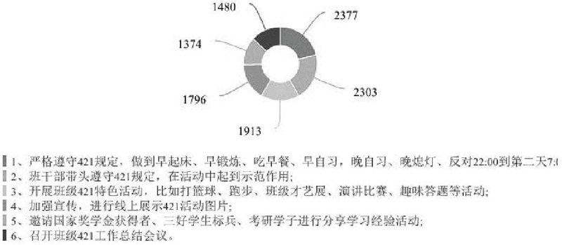 通过本次调查研究,我们可以发现学院推行“421”工作以来,在加强班级管理,促进学生养成良好生活作息习惯、培养自律意识方面起到了十分明显作用,得到了较大多数同学认可。从调研中我们发现在班级管理中必须要尊重班级主体地位,根据学院和班级情况制定班级管理制度,班主任和班干部在落实421工作中发挥着不可替代作用。但我们也清醒认识到部分学生没有严格遵守学院421工作制度,存在着没有按时就寝、深夜玩游戏、早上晚起床、没有坚持上早晚自习等不良现象。