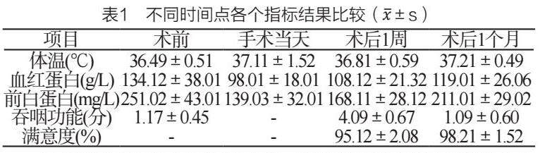 2.1不同时间点各个指标结果分析。与手术当天比较术后1个月血红蛋白、前白蛋白得到改善差异有统计学意义(P<0.05);与术后1周比较术后1个月吞咽功能和满意度得到提高,存在差异和统计学意义(P<0.05),见表1。