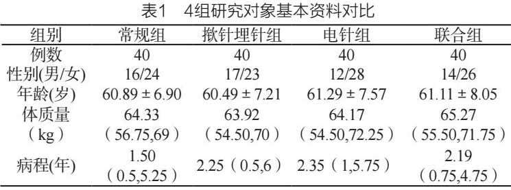 选择南昌市洪都中医院骨质疏松科2021年7月至2023年6月期间医治的160名门诊或住院KOA病人。采取随机数字表,把这些受试对象划分成4个组:揿针埋针联合电针组(以下简称联合组)、揿针埋针组、电针组及常规组,每组患者均为40例。对四组受试对象的基本信息展开统计学分析,发现P皆>0.05,可见不存在明显区别,四组病人可进行比较。见表1。本研究课题得到南昌市洪都中医院伦理委员会准可,证号为“KYKS-202135”。
