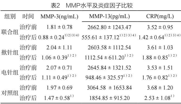 表1示,干预前4组受试对象CRP、MMP-3与MMP-13水平比较,差异未见显著性(P>0.05);治疗后,四组MMP-3、MMP-13指标水平及CRP水平均较干预前下降,差异具显著性(P<0.05);详见表2;