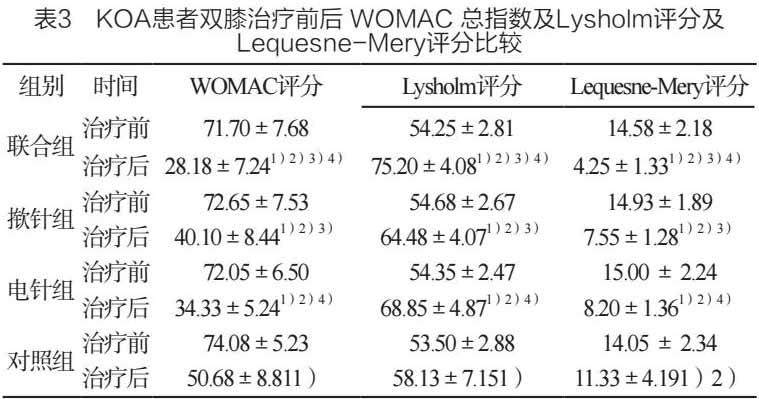 干预前4组KOA病人 Lequesne-Mery与Lysholm评分,还有WOMAC总指数对比,P>0.05,差异缺乏显著性;干预后,4组Lequesne-Mery评分与WOMAC总指数与未干预时相比皆降低,Lysholm评分与未干预时相比增加,差异具显著性(P<0.05);详见表3。