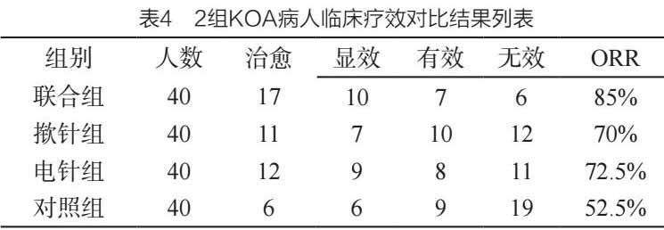 表4示:4组KOA病人干预后,在总有效率(ORR)方面,对照组、电针组、揿针组与联合组依次是52.5%、72.5%、70%与85%;在此项指标上,4组之间差异具显著性(z值为10.238,P值为0.017)。