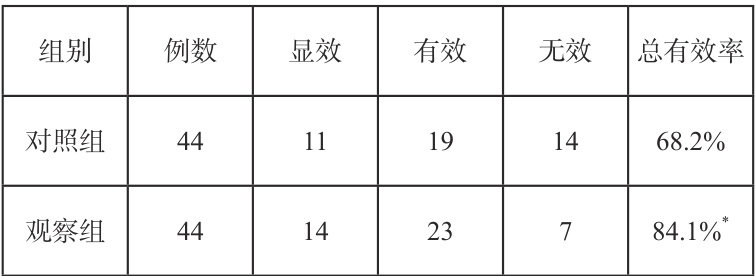 2.1 临床疗效:治疗后,观察组的总有效率为 84.1% (其中显效14例、有效23例、无效7例),显著高于对照组的 68.2% (显效11例、有效19例、无效14例),两组间差异具有统计学意义( P<0.05 ),见表l。