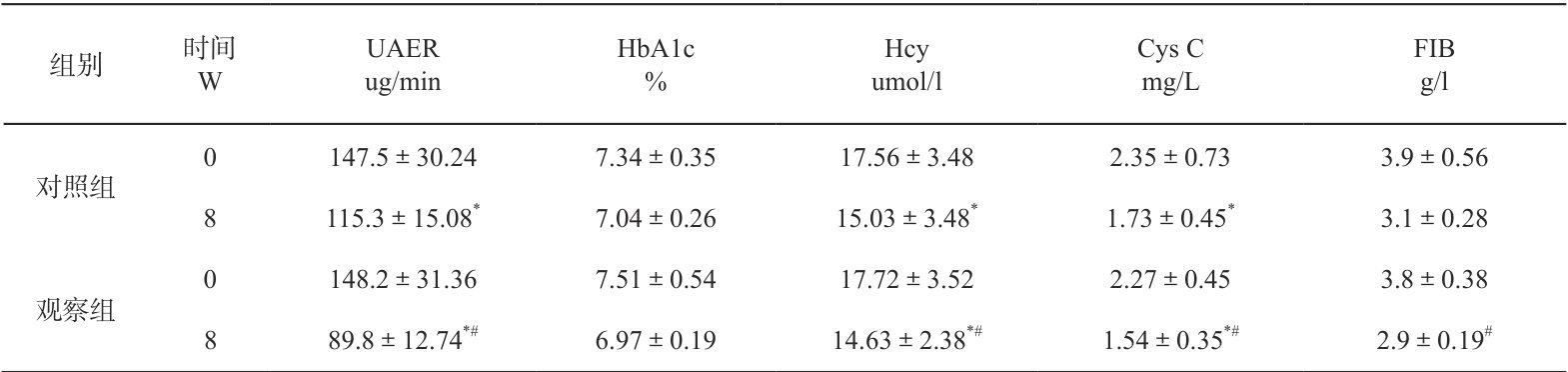 1.3 观察指标:血清同型半胱氨酸(Hcy)、胱抑素C(Cys C)、糖化血红蛋白(HbA1c)、尿白蛋白排泄率(UAER)、T淋巴细胞亚群及血浆纤维蛋白原(FIB)的情况。记录患者用药后不良反应。