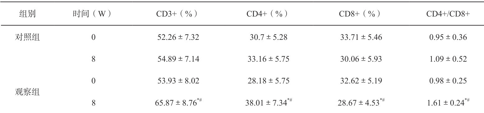 表3 两组治疗前后T淋巴细胞亚群水平比较(±s)
