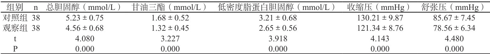 与对照组相比,观察组舒张压、收缩压以及相关血脂指标的数值更低, P<0.05 ,见表1: