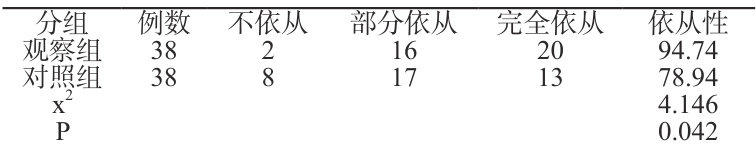 与对照组相比,观察组依从性更高, P<0.05 ,见表2: