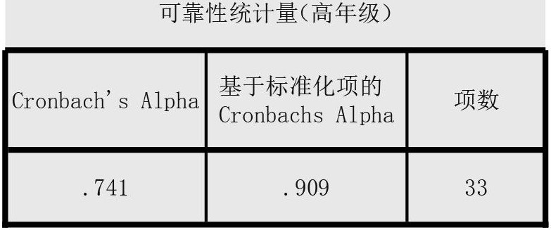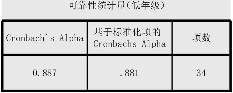 克朗巴哈系数(Cronbach’α)是一个统计量,是指量表所有可能的项目划分方法的得到的折半信度系数的平均值,是最常用的信度测量方法。内部一致性Cronbach’α系数值越大,问卷信度越高。若一份量表有n题,题间的平均相关系数为r,则此量表的标准化α系数为α=nr/[(n-1)r+1]。通常Cronbach’α系数的值在0和1之间。如果α系数不超过0.6,一般认为内部一致信度不足;达到0.7-0.8时表示量表具有相当的信度,达0.8-0.9时说明量表信度非常好。通过可靠性统计量表格可以得出,低年级的量表34道题目内部一致性Cronbach’α系数的值是0.887,超过了0.8以上的要求,表示该量表中的34道题的内部一致性较好。高年级的量表33道题目内部一致性系数Cronbach’α的值是0.741,达0.7,说明量表具有相当的信度。