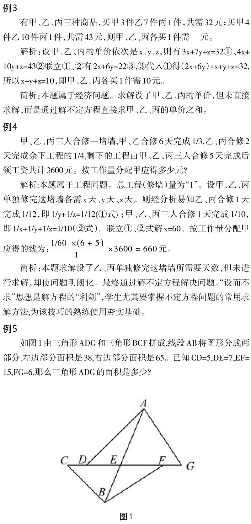 简析:本题求解设了乙、丙单独修完这堵墙所需要天数,但未进行求解,却使问题明朗化。最终通过解不定方程解决问题。“设而不求”思想是解方程的“利剑”,学生尤其要掌握不定方程问题的常用求解方法,为该技巧的熟练使用夯实基础。
