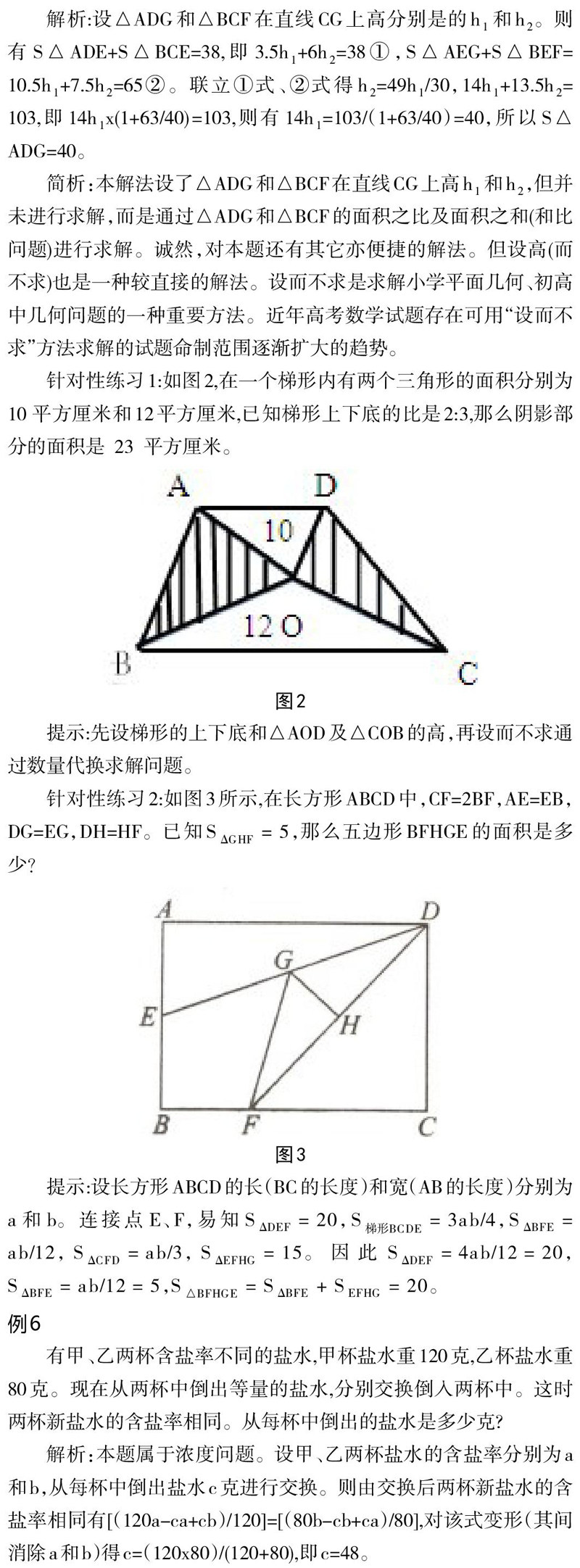 简析:该解法是利用方程的思想,求解过程假设了甲、乙两杯盐水的含盐率,但未求解。而是通过方程反映出题目的核心关系。因此有时在准确理解问题的基础上我们要合理地、大胆地进行假设未知量。从本题求解可看出题述背景下倒出交换的溶液的质量与两原溶液浓度无关。其数值为:两原溶液质量之积除以两原溶液质量之和。