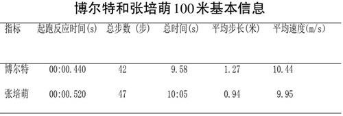 [指标 起跑反应时间(s) 总步数 (步) 总时间(s) 平均步长(米) 平均速度(m/s)\&博尔特 00:00.440 42 9.58 1.27 10.44\&张培萌 00:00.520 47 10:05 0.94 9.95\&]