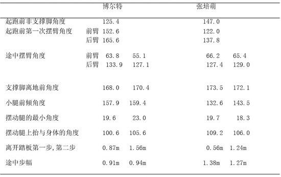 2.3.2测量数据中,博尔特在起跑前第一次摆臂角度和途中摆臂角度的角度大部分都大于张培萌的摆臂角度,摆臂幅度越大,利于运动员比赛是增加动力。