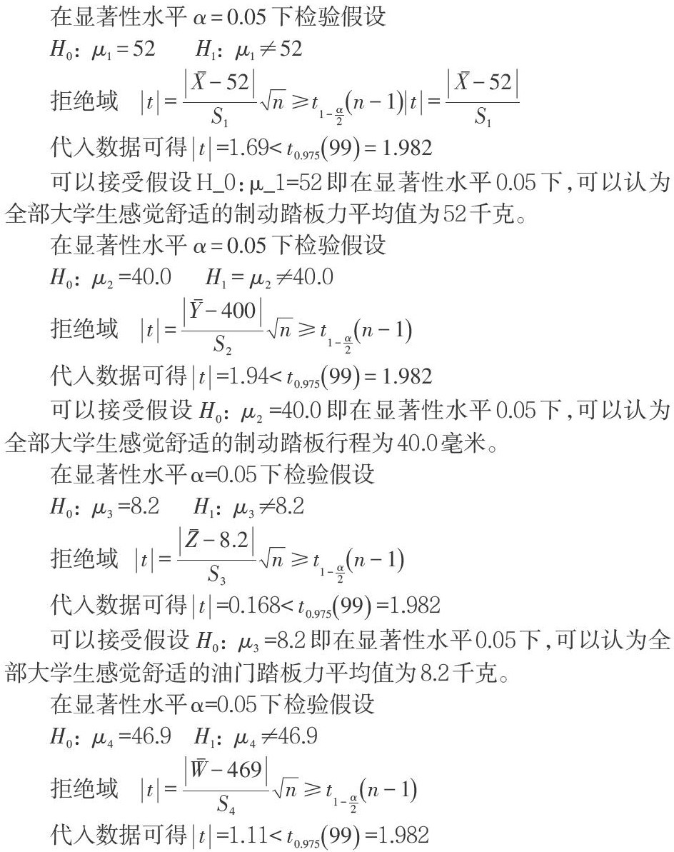 可以接受假设H0:µ4=46.9即在显著性水平0.05下,可以认为全部大学生感觉舒适的油门踏板行程平均值为46.9毫米。