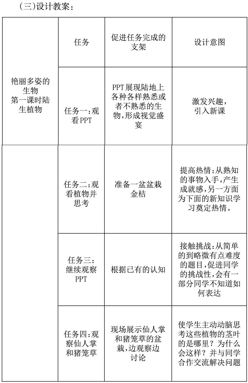 (一)教材分析:本节内容位于科学教材七年级(上)第一章第1节。“艳丽多姿的生物”属于“生命科学”学科,是学生进入初中后,第一次认识生物。本章分两节,目的是通过对生活在不同环境条件下的生物的形态结构和生活习性的分析,了解生物体和它的生存环境是相适应的并且初步学会进行科学探究。从这个学科视野出发,可以发现,本章内容《地球上的生物》涉及到后续相关内容,“生物的基本特征”,“生物的主要类群”,“生物的多样性”,“地球上的生物圈”等等,这些内容都与本节内容存在着逻辑关系。艳丽多姿的生物对环境的适应,形成了一定的基本特征,对环境的不同方式适应使其有了主要类群的划分,对环境的适应使多样性保存下来,艳丽多姿的生物又是生物圈的组成成分。因此本章的内容对后面的教学有着举足轻重的地位。