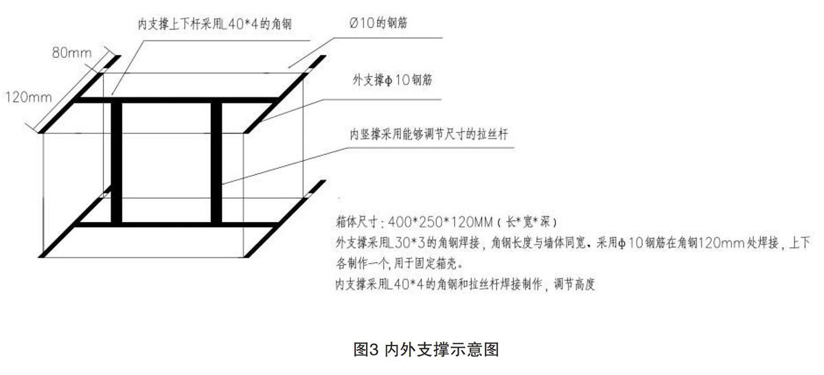 在订制箱体时,严格要求箱体钢板厚度符合标准图集和设计图纸规定。在建筑剪力墙内配电箱一次性预埋,首先根据图纸设计管线规格型号,要用开孔器开孔,做到一孔一管,并结合管路排列布置好不同规格型号的进线孔的位置,防止配管时进出管路交叉;然后在现场利用角钢或钢筋根据配电箱箱体尺寸大小利用定位筋的原理,在箱体外部焊接制作一个与墙等厚的外部支撑模具,外部支撑模具用L30×3的角钢焊接,角钢长度与墙体同宽,再利用φ10的钢筋在角钢120 mm处焊接,上下各制作一个,用于固定箱壳(如下图3、4、5所示)。