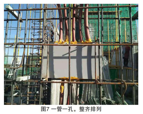 建筑物剪力墙配电箱预埋时,先按设计高度进行定位;再根据箱体尺寸,切割钢筋,切割范围以能将箱体水平放进为宜;然后将配电箱箱体按照设计高度进行安装,安装时不要把钢筋和箱体焊在一起,要用水平尺掌控箱体的水平度进行找正,箱体找正找平后(如下图6所示),将加工的外部支撑模具与剪力墙钢筋焊接(绑扎)牢靠即可,使箱体前后能够移动,然后在箱体四周设“加固筋”。箱体在剪力墙上安装完毕后,将线管插入配电箱,应一管一孔,管口无毛刺,排列整齐,间距均匀[3](如下图7所示)。在模板安装时利用模板即可校正好箱体,在模板安装完毕后要及时注意检查,发现箱体有没能紧贴模板的要进行调整。