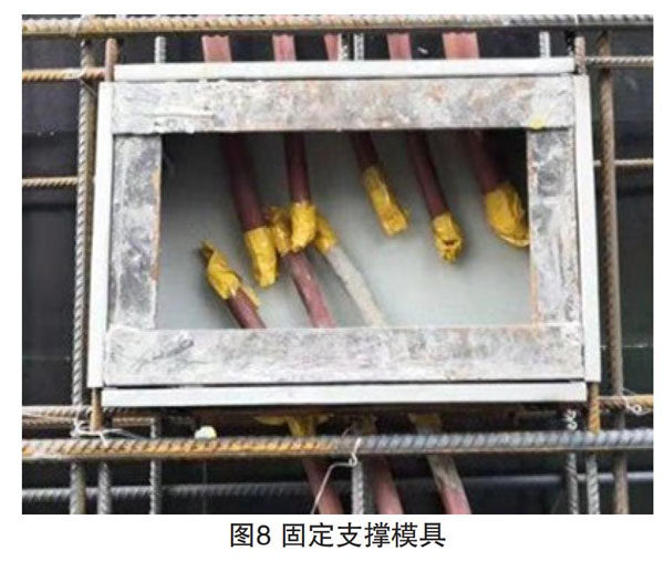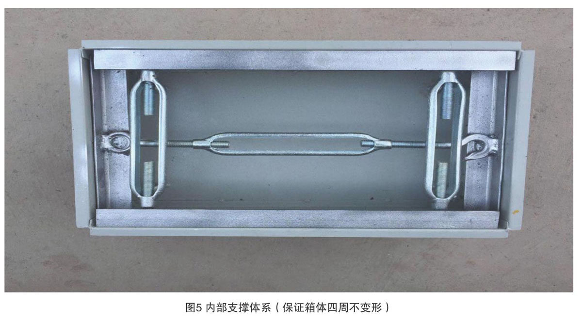 安装结束后对箱体内部进行加固,以防混凝土挤压、振捣变形,加固采用两种方式,一种为将按照箱体结构尺寸制作的固定模具(如下图8所示)放进箱体即可,另一种为可调节模具(如下图9所示),用螺栓紧固。配电箱箱体整个安装完毕后,要对土建钢筋进行修复加固[4]。此次配电箱箱体一次性预埋项目采用了箱体表面不缠绕封堵的方法,既节约成本减少工作量,还可以提高拆模后整体观感,达到了“双优”目的。