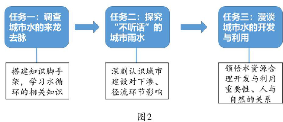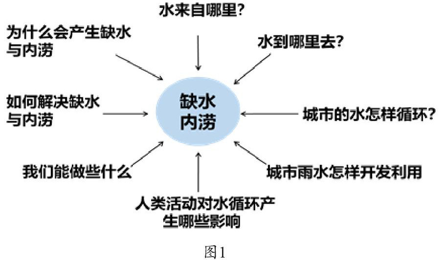 比如,学习“水循环”一节时,本课的学习重点已经不是让学生掌握多少理论知识,而是要通过启发学生基于区域经常性发生城市内涝这一真实问题情境,培养学生如何基于真实的问题情境如何解决实际城市内涝的问题,有必要设计一些有意义的地理实践活动。比如,通过问题链的设置启发学生思考区域水资源问题(见下图1),开启头脑风暴,让学生在课下通过走访、调查、查询资料等方式收集信息,通过设置三个小组合作学习任务:调查城市水的来龙去脉;探究“不听话”的城市雨水;漫谈城市水的开发与利用(见下图2)。从而实现学生能通过信息收集、问题思考、问题解决等思考路径,制定如何解决城市内涝的方案和思考如何合理进行城市水资源的开发和利用,并实现循环利用水资源的目标,这样的地理实践不仅提升学生的区域认知素养,也能够实现培养学生基于真实问题情境下解决实际问题的思维方法,这是富有价值的。