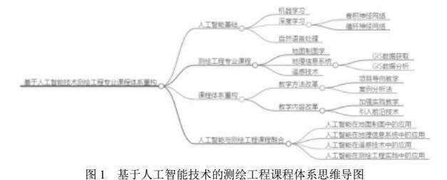 依据上述要求构建基于人工智能技术测绘工程专业课程体系,需要在原有测绘工程专业课程体系的基础上精简课程并引入人工智能相关课程,包括人工智能基础知识以及将人工智能与测绘工程课程融合,设置理论和实践课程,不仅教授人工智能知识,也锻炼学生在实际测绘中使用人工智能技术解决问题的能力。教学方法以项目导向教学为主,辅以案例分析。重构基于人工智能技术的测绘工程课程体系思维导图,如图1所示。
