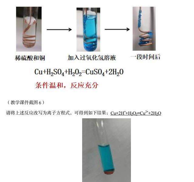 [教师] 核心元素铜元素的价态由0价升高到+2价,被氧化,需要引入氧化剂,可加入酸性H2O2溶液,几分钟后无色溶液逐渐变成蓝色,说明有硫酸铜产生。